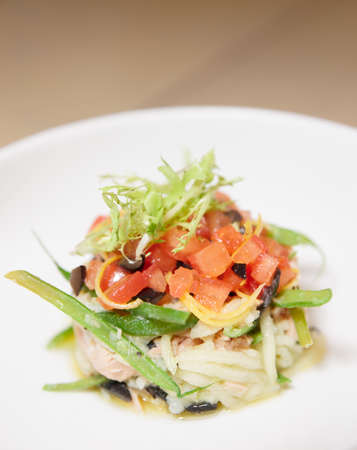 Tuna dish with tomato tartare and lettuce on porcelain plate