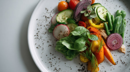 A vibrant assortment of fresh vegetables including cucumbers, radishes, cherry tomatoes, and herbs is beautifully arranged on a white plate. This colorful dish showcases seasonal produce