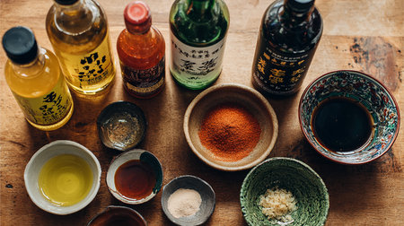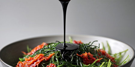AI Generated. soy sauce being drizzled over a bowl of seaweed salad with kimchi