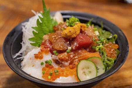 Close up shot of a bowl of fresh sashimi at Sendai, Japan