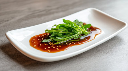 A stylish presentation of fresh green herbs drizzled with soy sauce and topped with sesame seeds, perfect for modern cuisine and elegant dining experiences.