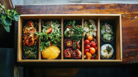 A beautifully crafted wooden bento box filled with fresh, healthy ingredients, each element thoughtfully placed