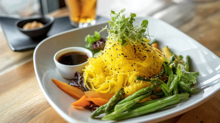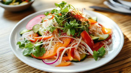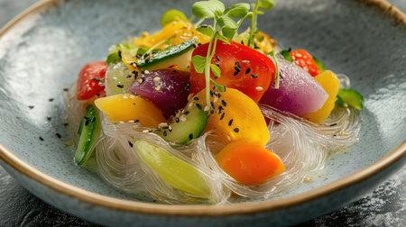 A vibrant salad featuring fresh vegetables, glass noodles, and delicate greens, beautifully presented in a bowl. Perfect for healthy meals or gourmet dining.