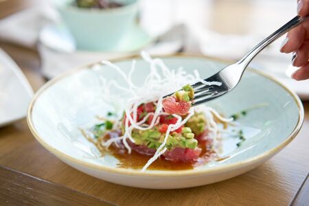 Closeup fork with pieces of food. Woman eating tartar in the restaurant. Variety of dishes on the table. Italian cuisine