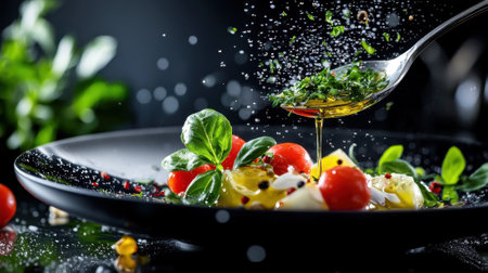 A skilled chef drizzles olive oil over a colorful salad featuring cherry tomatoes, greens, and herbs. The kitchen is well-lit, enhancing the dish's freshness.
