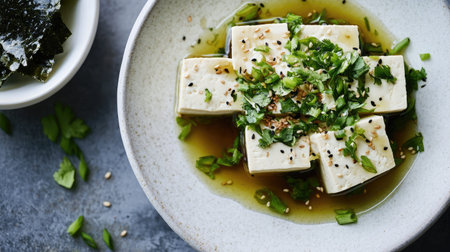 Fresh tofu served with herbs and sesame oil, garnished with green onion, on a grey plate. A delicious and healthy dish perfect for any meal.