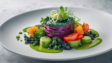 An exquisite dish featuring assorted colorful vegetables and tender herbs, presented in a sophisticated manner at a restaurant during lunchtime.