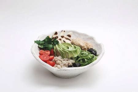 salad with smoked salmon and mixed greens in white bowl, square