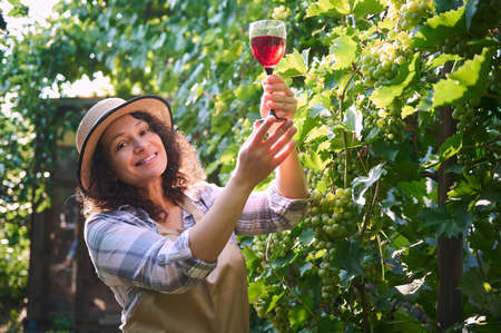 Delightful beautiful female winegrower, winemaker, vintner, viticulturist smiles sweetly, looks at the camera, holds a glass of red homemade wine sparkling in the sun, stands in the vineyards at dawn