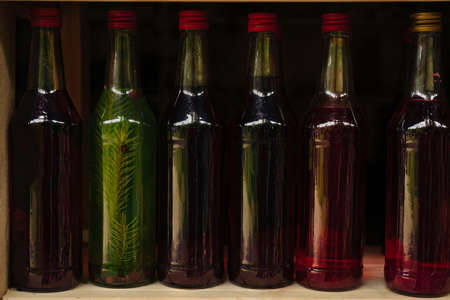 Group of glass transparent and dark bottles with corks of homemade berry and fruit wine stands against background of sunset on evening outside. Homemade wine. Natural. National alcoholic beverages.