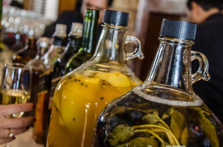 Assortment of five strong alcoholic drinks and spirits in small glasses. Different Lithuanian alcoholic beverages on a wooden bar counter.