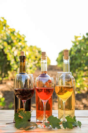 Flat-lay of red, rose and white wine in glasses and Branch of vine leaves on white background
