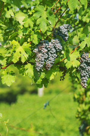 Closeup of blue grape in vineyard with sunlight. Winery and grapevine growing background frame. Grape growing and wine making design banner.