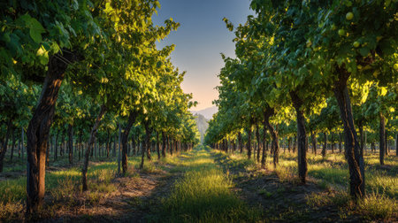 Neat rows of grapevines bask in the golden light of sunset at a vineyard