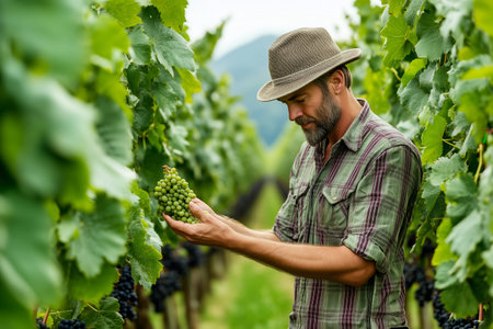 A farmer inspects ripe grape clusters in a vineyard during the growing season in the countryside