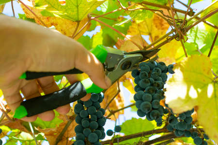 cut ripe blue grapes with pruning shears in the fall for making homemade wine