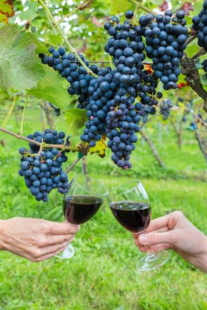 Cheers! Celebratory toast of red wine at vineyard. Woman holding wineglass outdoors. Front view and selective focus
