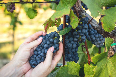 Woman picking grapes. Gardening at vineyard. Female hands holding blue grape before harvesting