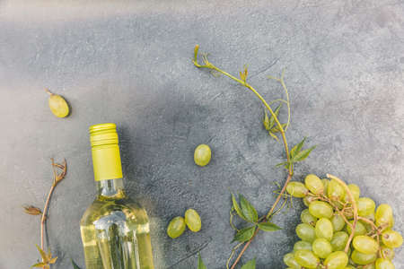 Top view of bottle white wine, green vine and ripe grape on vintage gray stone table background. Wine shop wine bar winery or wine tasting concept.