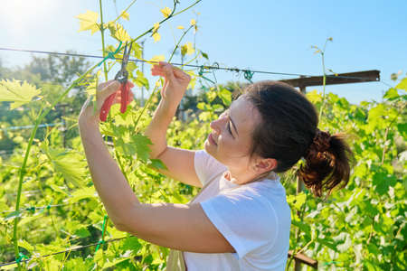 Spring summer work in the vineyard, woman gardener with shears doing seasonal pruning of grape bushes. Farm, hobby, agriculture concept