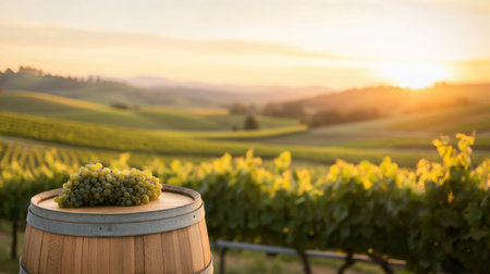 Serene vineyard landscape features fresh green grapes on a rustic barrel under a glowing sunset. The rolling hills create a picturesque backdrop of natural beauty.