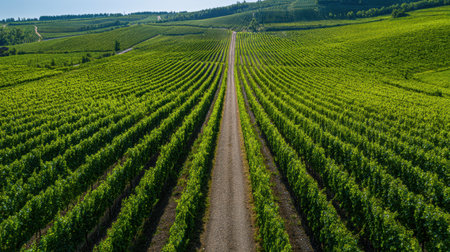 A serene vineyard landscape showcasing vibrant green grapevines stretching towards the horizon, set against a bright blue sky and rolling hills. Perfect for nature lovers.