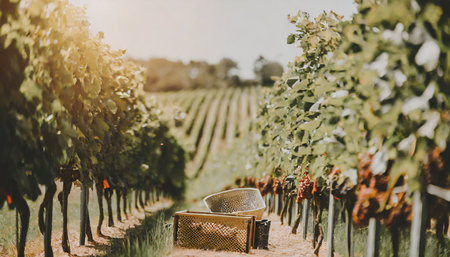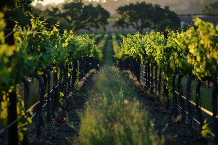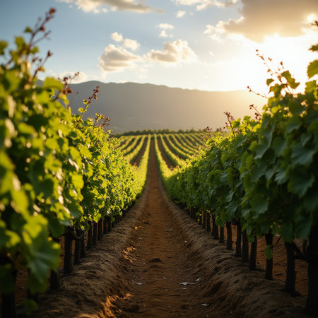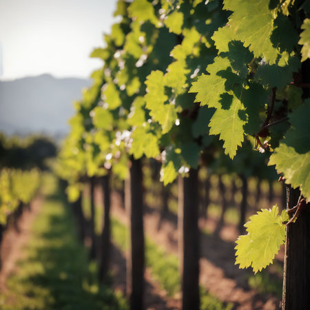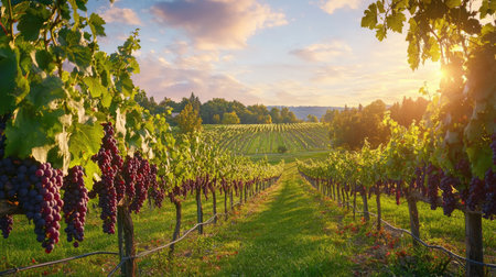 A picturesque vineyard scene with rows of grapevines stretching into the distance, highlighting the lush green leaves and ripe grapes ready for harvest.