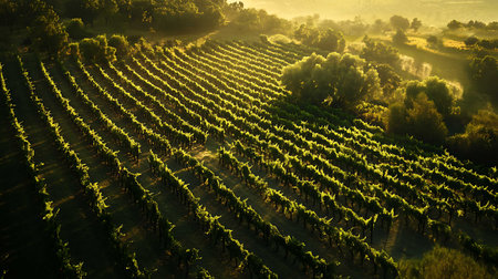 A sunrise over a vineyard with the early morning light highlighting the rows of grapevines and creating a warm, inviting glow across the landscape.