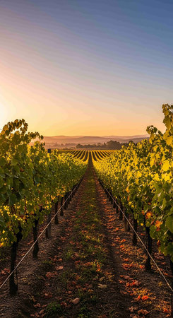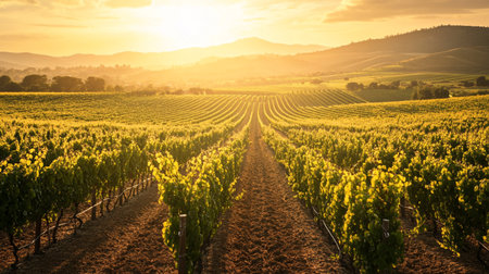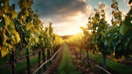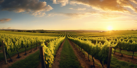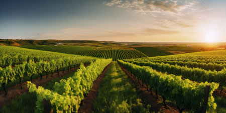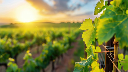 A breathtaking view of a vineyard at sunset, showcasing vibrant green vines stretching towards the horizon, bathed in warm, golden light of the evening sun.