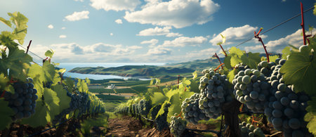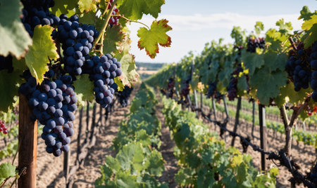 Grapevines laden with dark berries stretch along rows in vibrant vineyard. Sunny atmosphere enhances idyllic landscape. Concept of agriculture, winemaking, organic farming.