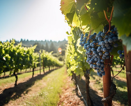 ripe grapes on the vine, bathed in sunlight, with the backdrop of a lush vineyard stretching into the distance. Generative AI