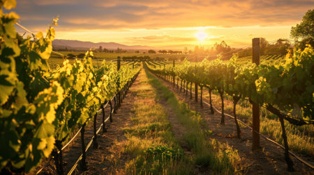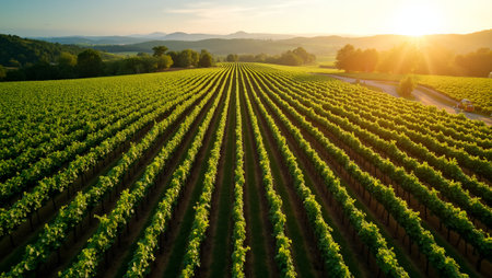 A scenic vineyard is illuminated by the warm glow of the setting sun, highlighting the neatly arranged rows of grapevines stretching across the landscape.