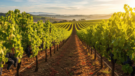 The sun rises gently over a tranquil vineyard, where winding rows of grapevines stretch toward distant hills, inviting a peaceful exploration of nature's beauty.