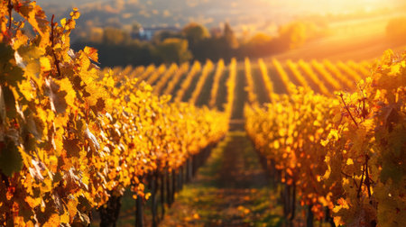 Stunning vineyard landscape in autumn, vibrant golden leaves under the warm sun, rows of grapes stretching toward the horizon.