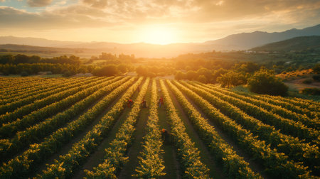 Winegrowers harvesting grapes in vineyard rows at sunset, creating scenic agricultural landscape