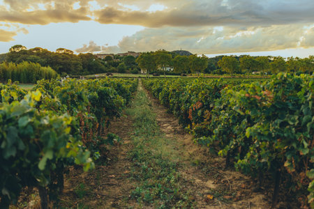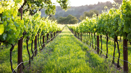 A serene view of lush green vineyard rows stretching into the distance, bathed in golden sunset light. This picturesque scene showcases the beauty of nature and agriculture, highlighting the healthy growth of grapevines in a tranquil countryside setting.