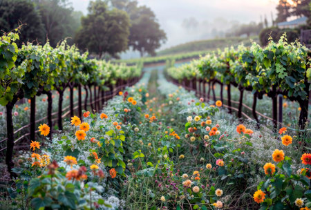 A picturesque vineyard scene showcasing blossoming grapevines bathed in the warm glow of a golden sunrise, evoking peace and natural beauty in the countryside.