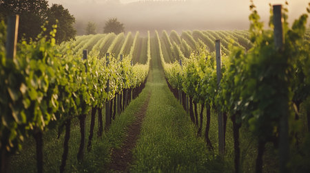A stunning sunrise illuminates a lush vineyard, casting golden light over the green rows of grapevines. Mist rises gently, enhancing the serene landscape.