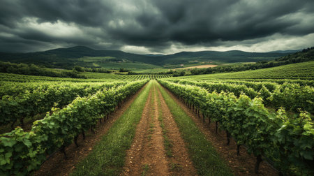 This stunning vineyard landscape features lush green rows under a dramatic cloudy sky, set against rolling hills. Perfect for themes of nature and agriculture.