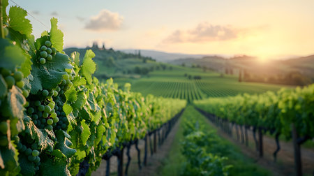 Experience the calming beauty of a vineyard at sunset, with vibrant green grapevines illuminated by golden light, creating a breathtaking rural landscape.