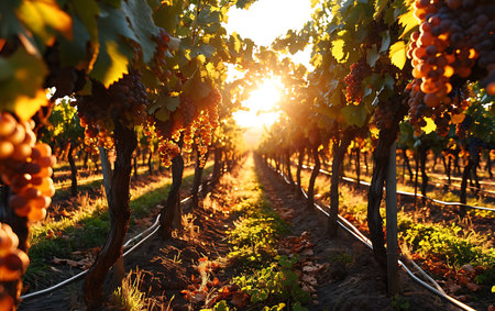 A vineyard at sunset with endless rows of grapevines creating serene landscape