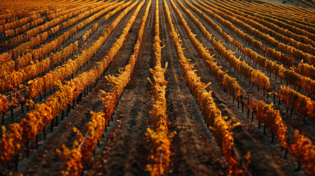 Sunset casting a golden glow over symmetrical rows of vineyard, highlighting the autumnal colors of the grape leaves.