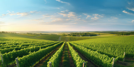 A panoramic view of endless rows of grapevines created with Generative AI technology.