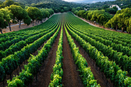 Biodynamic Vineyard Geometry Overhead view of regenerative vineyard rows creating abstract curved line composition following natural topography in seasonal grape