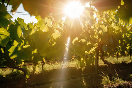 a vineyard with sunbeams streaming through the grape leaves, illuminating the vines, created with generative ai