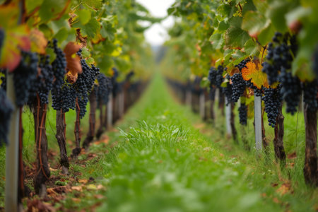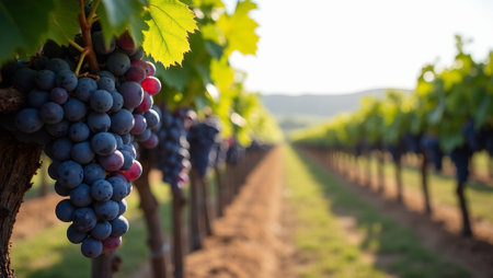 Autumn harvest in a vineyard lush green fields and dark blue grapes under sunlit skies