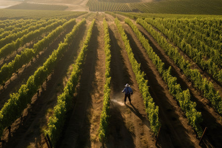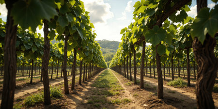 vineyard with wide rows of vines and sun shining through the leaves, created with generative ai