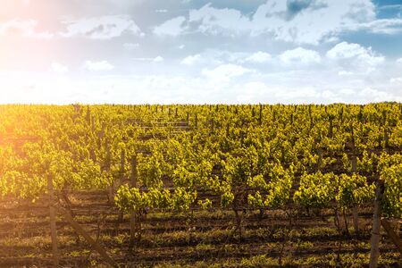 Panorama view of Green field with rows of vines. Ripe grapes for the production of fine wines.
