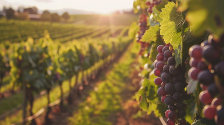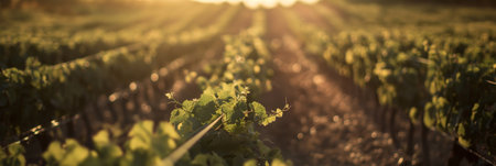 Warm golden sunlight sets over a picturesque vineyard, highlighting lush rows of grapevines in the serene countryside.