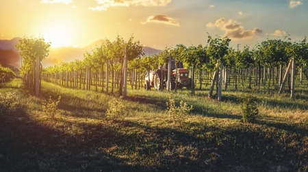 Tractor in the vineyard at sunset.